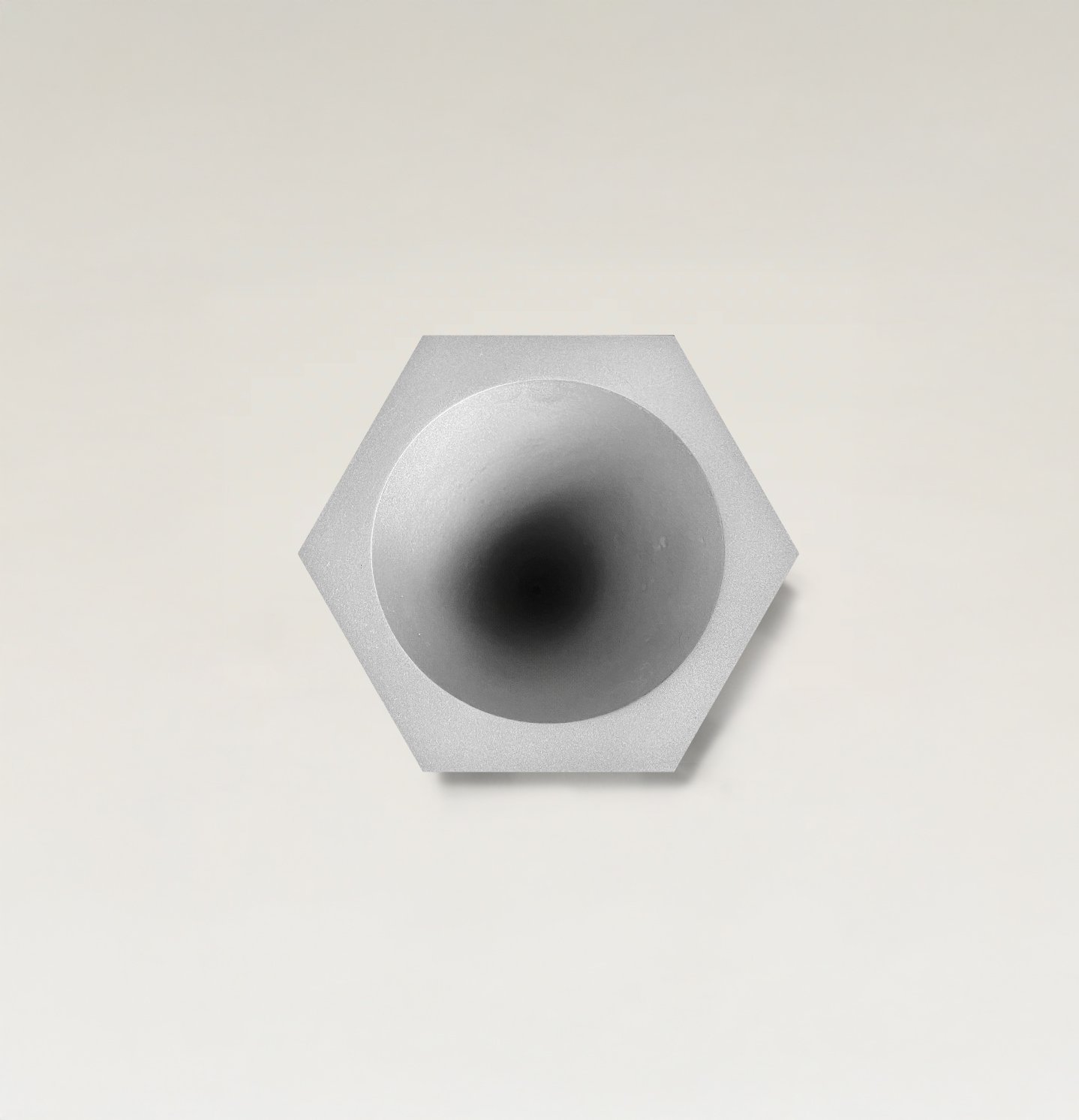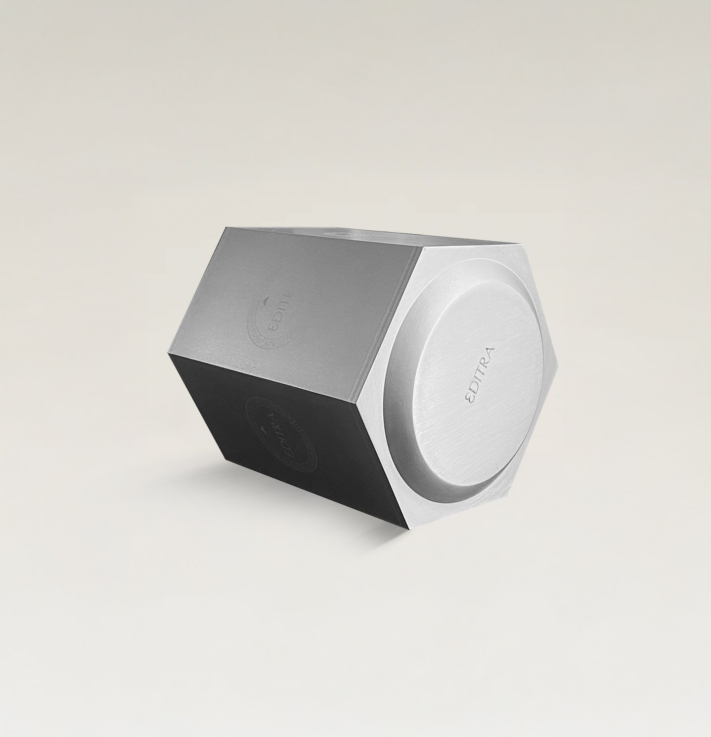 Polished machine-cut solid aluminum table object. Hexagonal form with single incision cone-shaped inner cavity for elegant display of pencils, scissors and editing tools. Engraved with Inaugural stamp. Aluminum may have natural blemishes, scratches and discolorations, and develops a patina over time. Weighs 2.2kg (4.9 lbs). Designed by Editra New York.